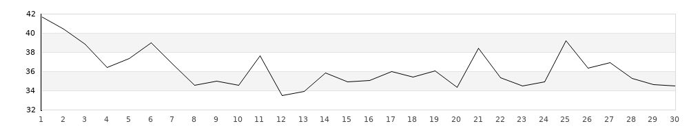 | 1 | 140 | T | 41,70 | - | - | 41,70 | | 2 | 140 | T | 40,41 | - | 1 | 50,41 | | 3 | 140 | T | 38,88 | - | - | 38,88 | | 4 | 140 | T | 36,40 | 1 | - | 38,40 | | 5 | 140 | T | 37,37 | - | - | 37,37 | | 6 | 140 | T | 38,98 | - | - | 38,98 | | 7 | 140 | T | 36,78 | - | - | 36,78 | | 8 | 140 | T | 34,57 | - | - | 34,57 | | 9 | 140 | T | 34,97 | - | - | 34,97 | | 10 | 140 | T | 34,54 | - | - | 34,54 | | 11 | 140 | T | 37,67 | - | - | 37,67 | | 12 | 140 | T | 33,50 | - | - | 33,50 | | 13 | 140 | T | 33,91 | - | - | 33,91 | | 14 | 140 | T | 35,83 | 1 | - | 37,83 | | 15 | 140 | T | 34,94 | - | - | 34,94 | | 16 | 140 | T | 35,09 | - | - | 35,09 | | 17 | 140 | T | 35,99 | 1 | - | 37,99 | | 18 | 140 | T | 35,45 | - | - | 35,45 | | 19 | 140 | T | 36,09 | - | - | 36,09 | | 20 | 140 | T | 34,33 | 1 | - | 36,33 | | 21 | 140 | T | 38,42 | - | - | 38,42 | | 22 | 140 | T | 35,36 | - | - | 35,36 | | 23 | 140 | T | 34,53 | - | - | 34,53 | | 24 | 140 | T | 34,93 | - | - | 34,93 | | 25 | 140 | T | 39,18 | - | - | 39,18 | | 26 | 140 | T | 36,37 | - | - | 36,37 | | 27 | 140 | T | 36,93 | - | - | 36,93 | | 28 | 140 | T | 35,31 | - | - | 35,31 | | 29 | 140 | T | 34,62 | - | - | 34,62 | | 30 | 140 | T | 34,52 | - | - | 34,52 |
