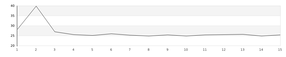 | 1 | 390 | T | 28,15 | 1 | 1 | 40,15 | | 2 | 390 | T | 39,84 | 1 | - | 41,84 | | 3 | 390 | T | 26,95 | - | - | 26,95 | | 4 | 390 | T | 25,56 | - | - | 25,56 | | 5 | 390 | T | 25,20 | - | - | 25,20 | | 6 | 390 | T | 26,01 | - | - | 26,01 | | 7 | 390 | T | 25,26 | - | - | 25,26 | | 8 | 390 | T | 24,87 | - | 1 | 34,87 | | 9 | 390 | T | 25,37 | - | - | 25,37 | | 10 | 390 | T | 24,90 | - | - | 24,90 | | 11 | 390 | T | 25,40 | 1 | - | 27,40 | | 12 | 390 | T | 25,59 | - | - | 25,59 | | 13 | 390 | T | 25,78 | - | - | 25,78 | | 14 | 390 | T | 24,89 | - | - | 24,89 | | 15 | 390 | T | 25,43 | 1 | - | 27,43 |
