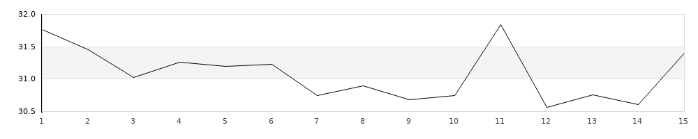 | 1 | 390U | T | 31,76 | - | - | 31,76 | | 2 | 390U | T | 31,45 | - | - | 31,45 | | 3 | 390U | T | 31,02 | - | - | 31,02 | | 4 | 390U | T | 31,26 | - | - | 31,26 | | 5 | 390U | T | 31,20 | - | - | 31,20 | | 6 | 390U | T | 31,23 | - | - | 31,23 | | 7 | 390U | T | 30,75 | - | - | 30,75 | | 8 | 390U | T | 30,90 | - | - | 30,90 | | 9 | 390U | T | 30,68 | - | - | 30,68 | | 10 | 390U | T | 30,75 | - | - | 30,75 | | 11 | 390U | T | 31,84 | 1 | - | 33,84 | | 12 | 390U | T | 30,56 | - | - | 30,56 | | 13 | 390U | T | 30,76 | - | - | 30,76 | | 14 | 390U | T | 30,61 | - | - | 30,61 | | 15 | 390U | T | 31,40 | - | - | 31,40 |